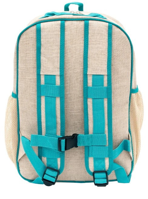 Linen/Cotton exterior fabric Machine washable (gentle cycle, cold) No dryers please Recommended for Children aged 6 - 11 2 stretchy mesh side pockets Lined nylon interior with zippered mesh pocket Reinforced bottom. Dimensions: 11"L X 5.5"W x 15.5"H