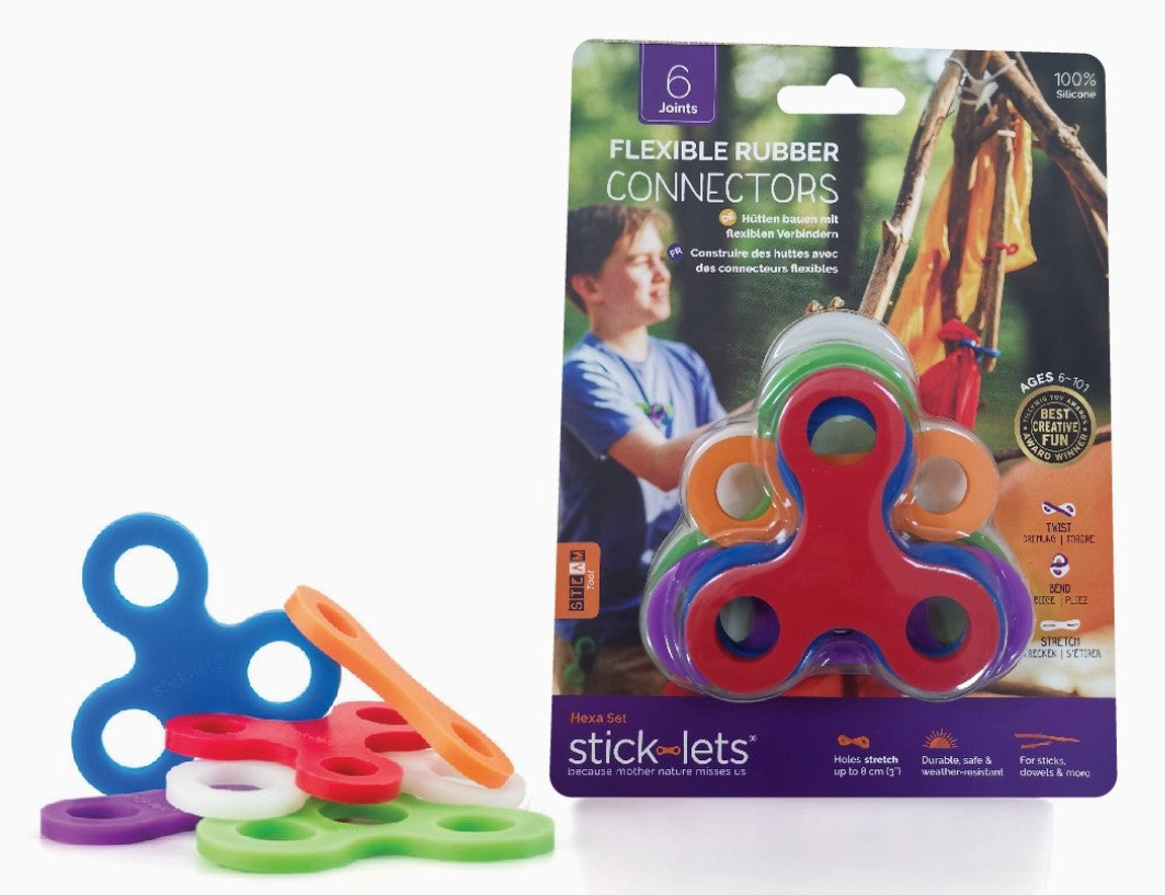 Our 6-piece Hexa Fort Set is the perfect size to get started with exploration and fort-building. Add more silicone joints to make a super sturdy tripod. Add a blanket on top and cozy up inside with your favorite book!
