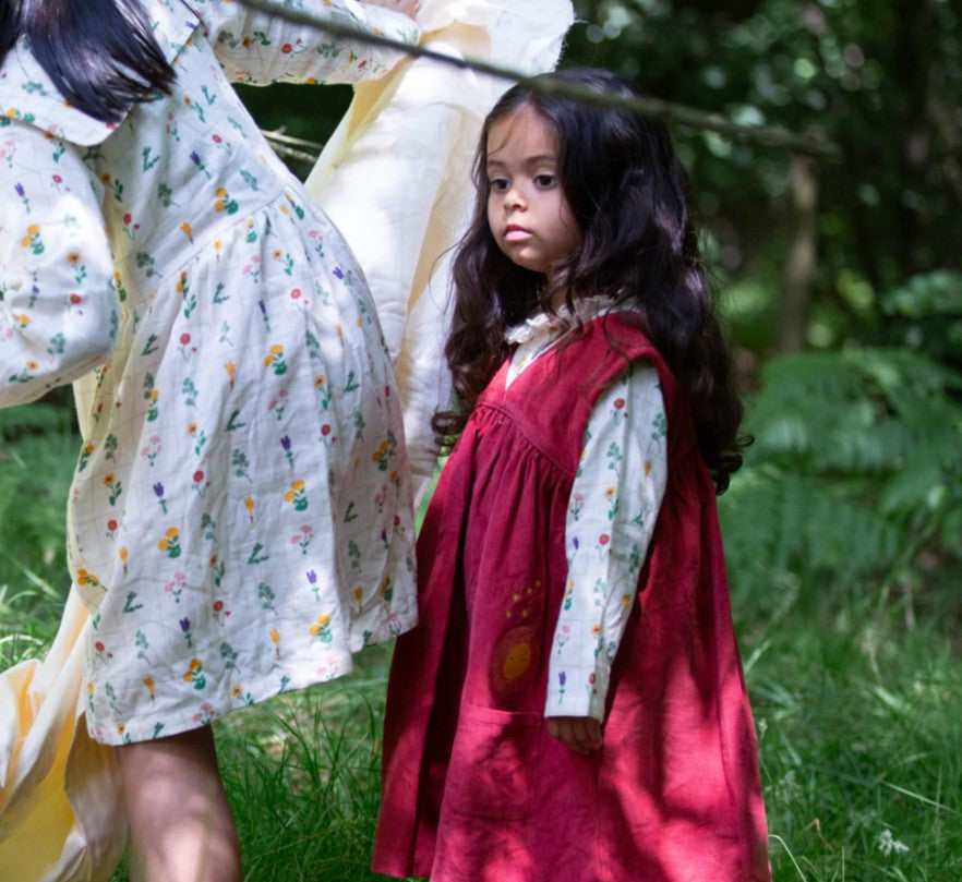 Classic pinafore style dress with a wide skirt to give lots of room for movement, designed to be worn year round. Layer over a cosy knit, leggings and warm jacket in winter, or pair with soft organic tees for spring.